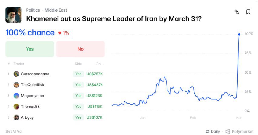 🔸 Միայն այն վարկածի վրա, որ հարձակումը տեղի կունենա հենց փետրվարի 28-ին, օգտատերերը խաղադրել են մոտ 89,6 միլիոն դոլար։ Բացի այդ, փետրվարին ստեղծված վեց դրամապանակներ ավելի քան 1,2 միլիոն դոլար շահույթ են ստացել՝ խաղադրույք կատարելով Խամենեիի մահվան վրա։ Շատ շահող խաղադրույքներ կատարվել են այն դրամապանակներից, որոնք համալրվել են հարձակումից պակաս, քան 24 ժամ առաջ։