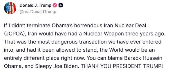 Թրամփ․ Իրանը 2023-ին արդեն միջուկային զենք կունենար, եթե չչեղարկվեր Համատեղ համապարփակ գործողությունների ծրագիր-ն Իրանը 2023 թվականին արդեն կունենար միջուկային զենք, եթե ԱՄՆ-ը դուրս չգար Համատեղ համապարփակ գործողությունների ծրագիր-ից, հայտարարել է Դոնալդ Թրամփը TruthSocial-ում․ «Եթե ես չեղարկած չլինեի Օբամայի հետ Իրանի կնքած սարսափելի միջուկային գործարքը (2015 թվականի ՀՀԳԾ-ն), ապա Իրանը արդեն երեք տարի առաջ կունենար միջուկային զենք։ Դա ամենավտանգավոր համաձայնագիրն էր, որում մենք երբևէ ներգրավված ենք եղել, և եթե այն թույլ տային պահպանել, աշխարհն այսօր լրիվ այլ վայր կլիներ։ Դուք կարող եք մեղադրել Բարաք Հուսեյն Օբամային և քնկոտ Ջո Բայդենին»։
