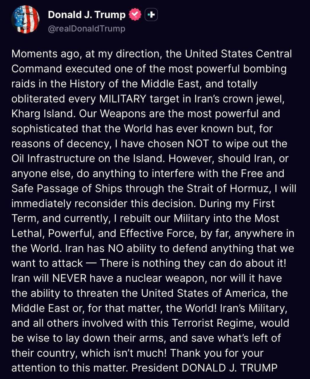 ➖ «Մի քանի րոպե առաջ իմ հրամանով ԱՄՆ Կենտրոնական հրամանատարությունը իրականացրեց Մերձավոր Արևելքի պատմության ամենահզոր ռմբակոծություններից մեկը և ամբողջությամբ ոչնչացրեց Իրանի կայսրության մարգարիտ համարվող Խարգ կղզու բոլոր ՌԱԶՄԱԿԱՆ թիրախները։